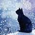 降りそそぐ雪と淡い光の中、猫が静かに冬の景色を味わう。