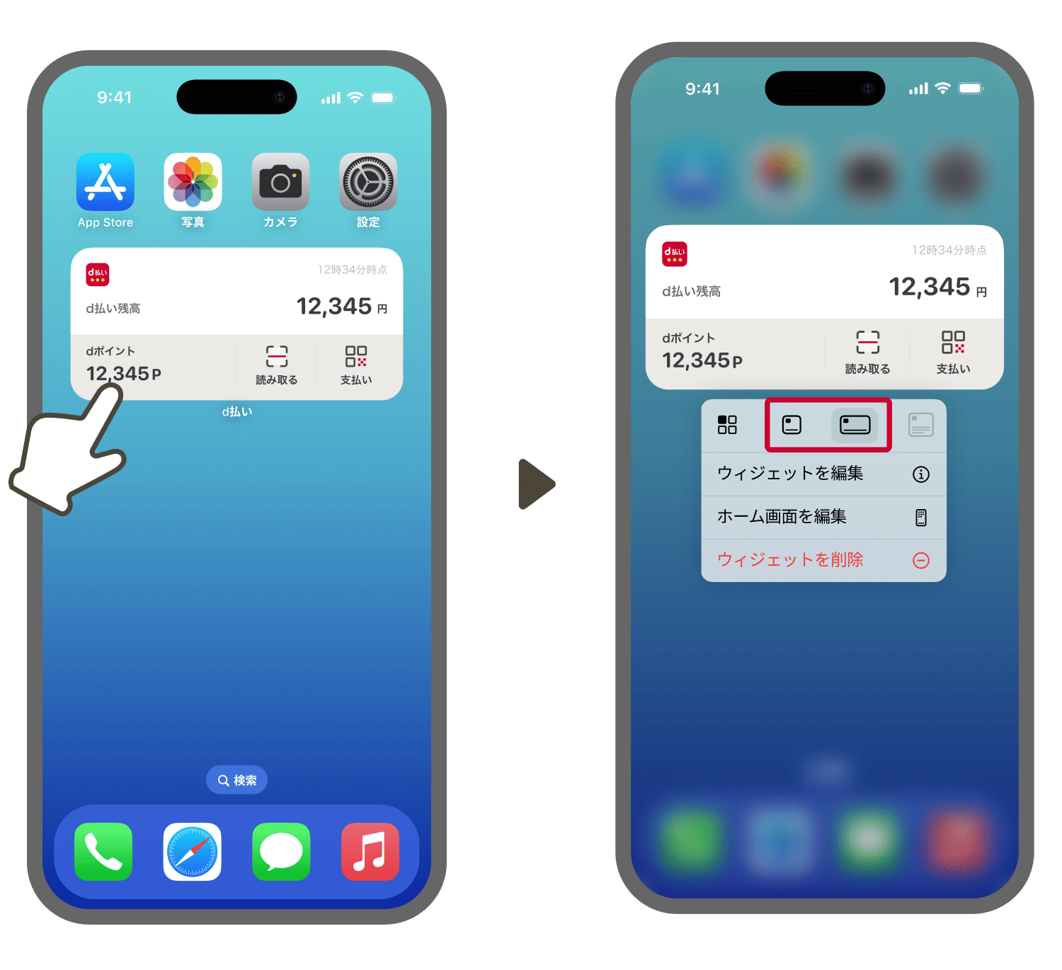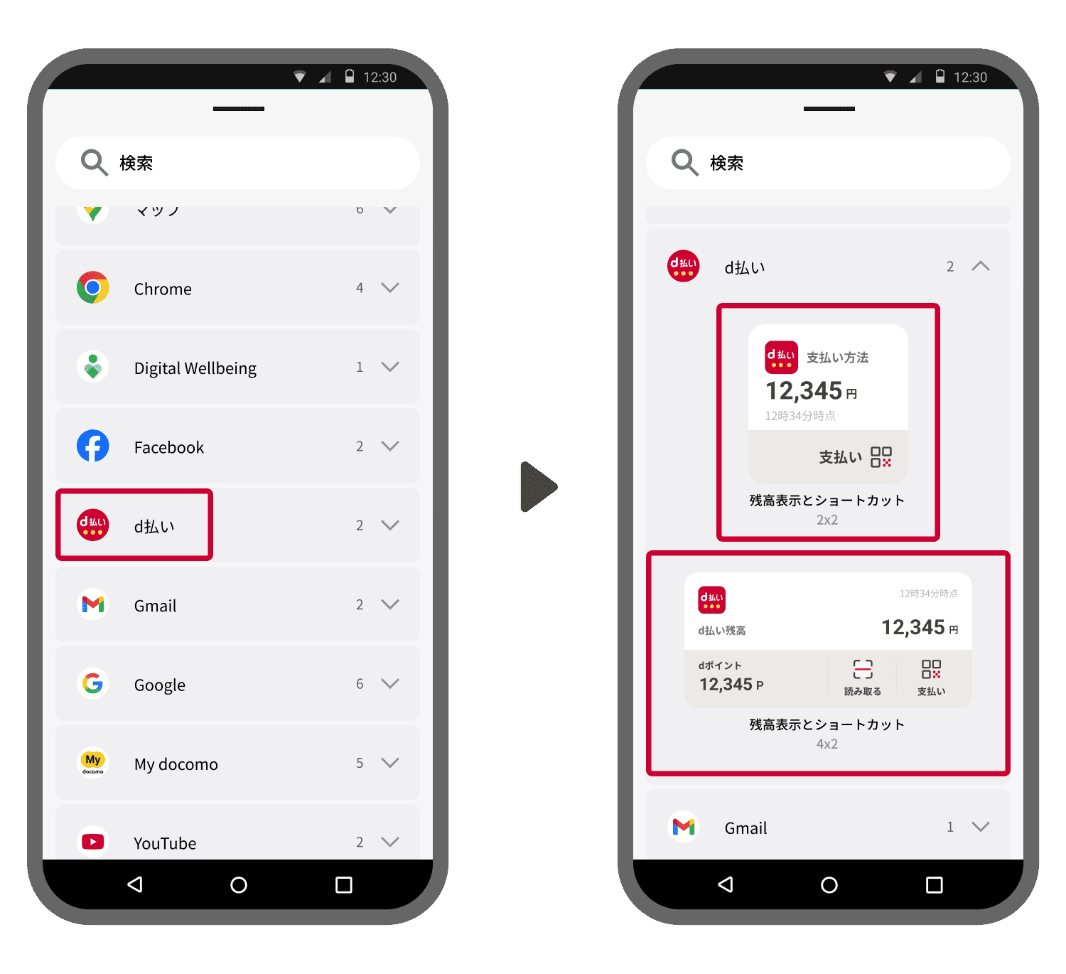 2.「d払い」を選択し、利用したいウィジェットを長押し
