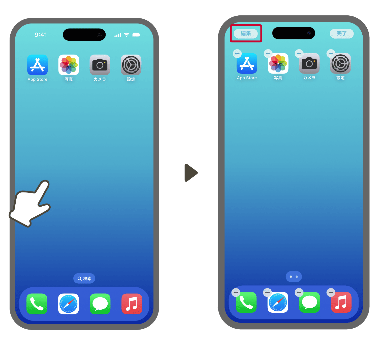 1.ホーム画面でウィジェットまたは何も表示されていない部分を長押しして、アプリが小刻みに揺れ始めたら指を放し、左上の「編集」をタップ