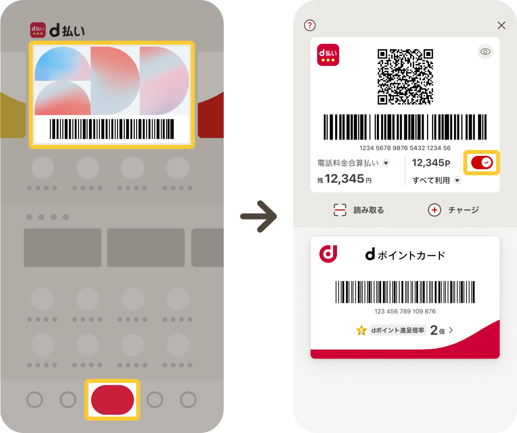 ホーム画面支払いバーコードエリアをタップもしくはホーム画面下部中央にある「支払い」ボタンをタップし、遷移先の支払い画面にてポイント利用ON/OFFの設定を行うことができます。