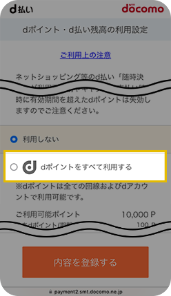 なお、Amazonの決済画面で「ポイント利用」のチェックを外した場合でも、上記の設定でd払いを使用すると、ポイントは自動的に利用されますのでご注意ください。