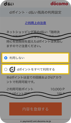 dポイントを利用されたくない場合には、ポイント事前設定画面上で、「利用しない」を設定してください。