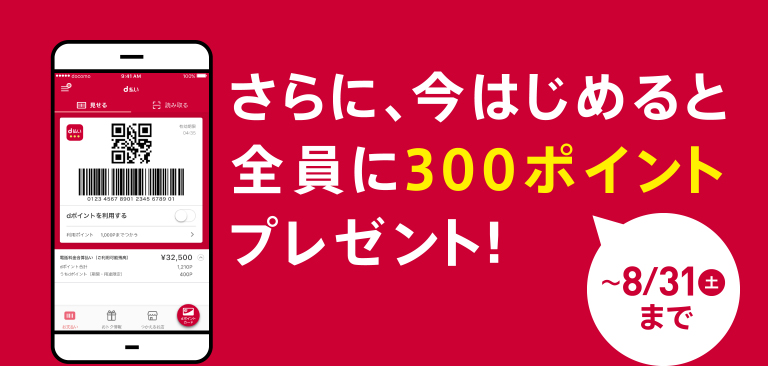 ※dポイント(期間・用途限定)とは、ドコモのスマートフォンの購入、dマーケット、ローソン等の街のお店での利用等、幅広い用途にご利用いただけますが、通常のdポイントと異なり、利用用途が限定され、進呈時にそれぞれ固有の有効期間が設定されています。