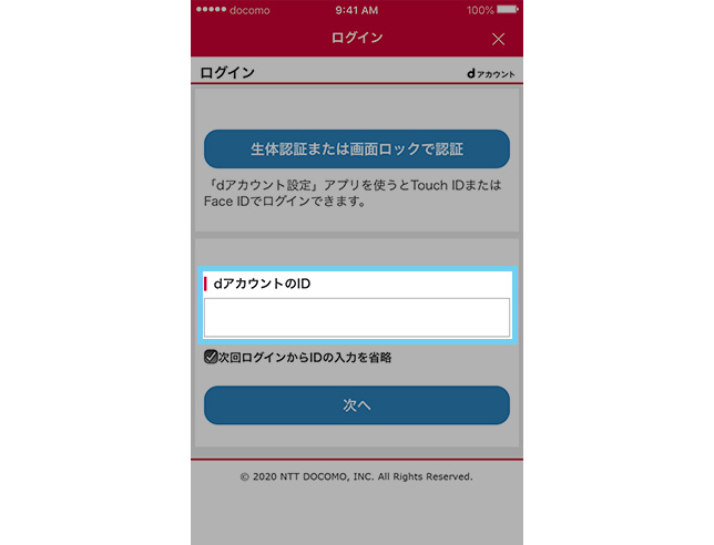 dアカウントを入力して次へ。