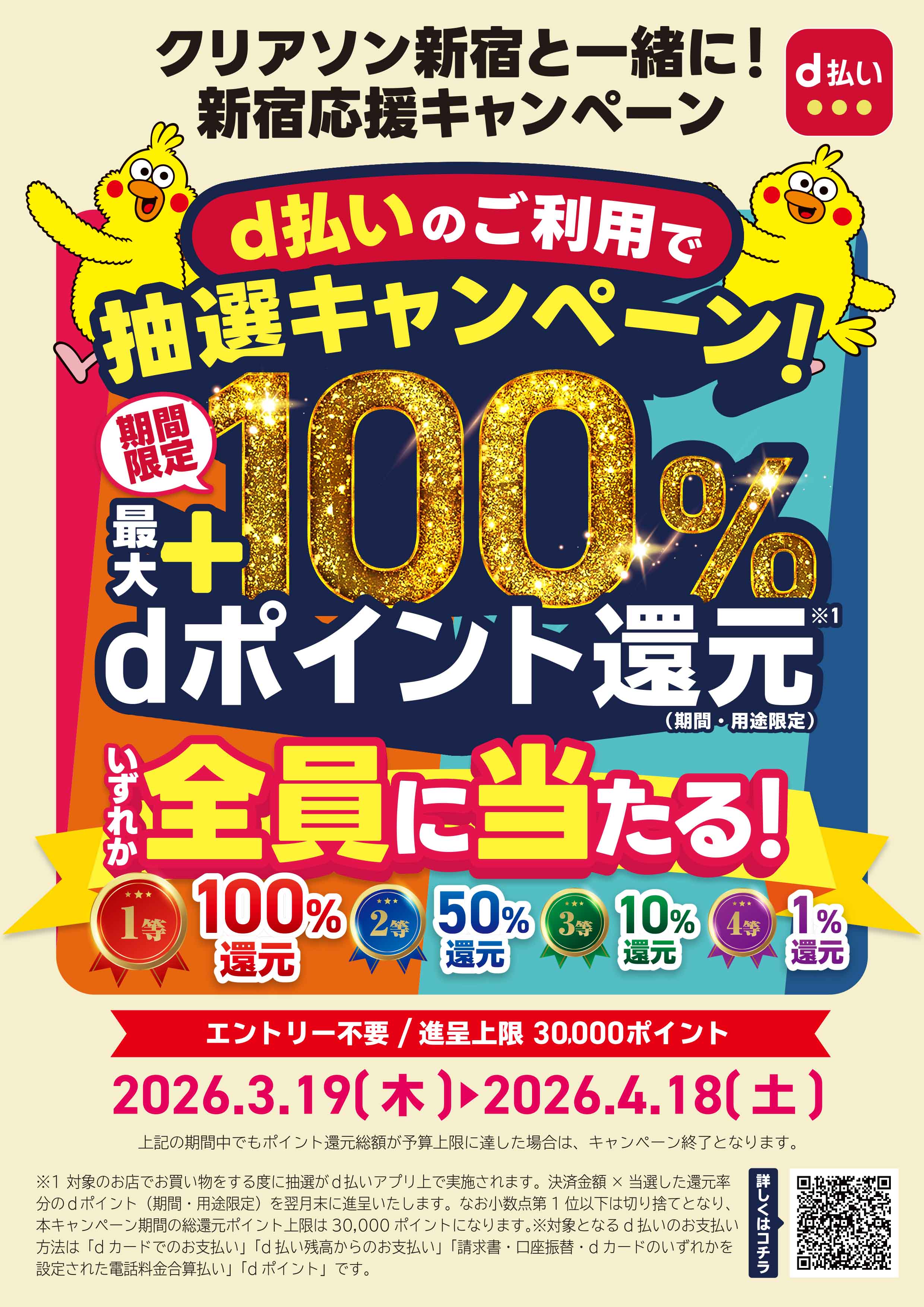 クリアソン新宿、クリアソン新宿超・応援店、西新宿一丁目商店街、新宿要通り共栄会、新宿百人町明るい会商店街振興組合、新大久保商店街振興組合の対象店舗にてd払いでお支払いされたお客様に対して、お支払い金額の最大100%分のdポイント(期間・用途限定)を進呈いたします。