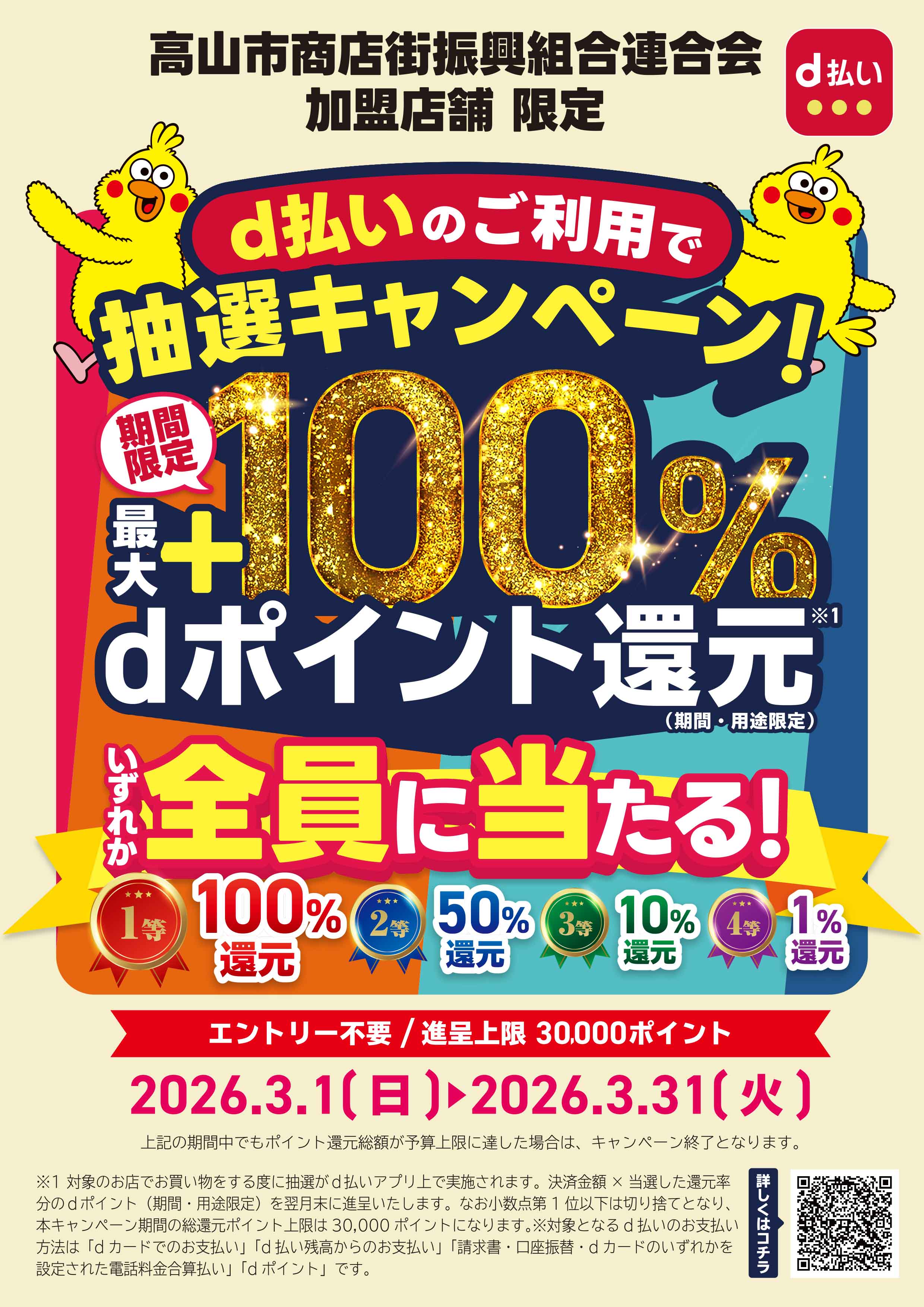 高山市商店街振興組合連合会の対象店舗にてd払いでお支払いされたお客様に対して、お支払い金額の最大100%分のdポイント(期間・用途限定)を進呈いたします。