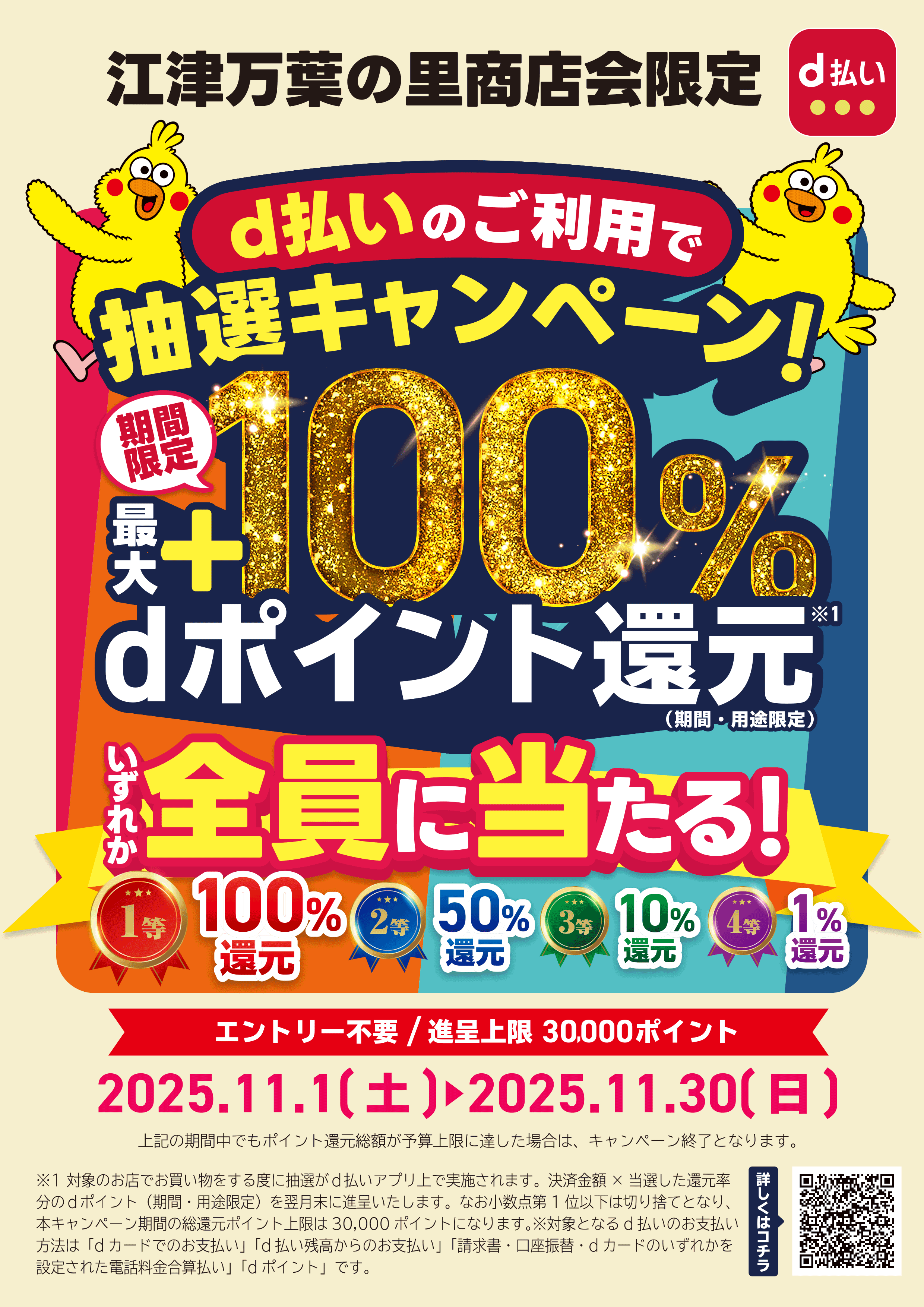 江津万葉の里商店会の対象店舗にてd払いでお支払いされたお客様に対して、お支払い金額の最大100%分のdポイント(期間・用途限定)を進呈いたします。