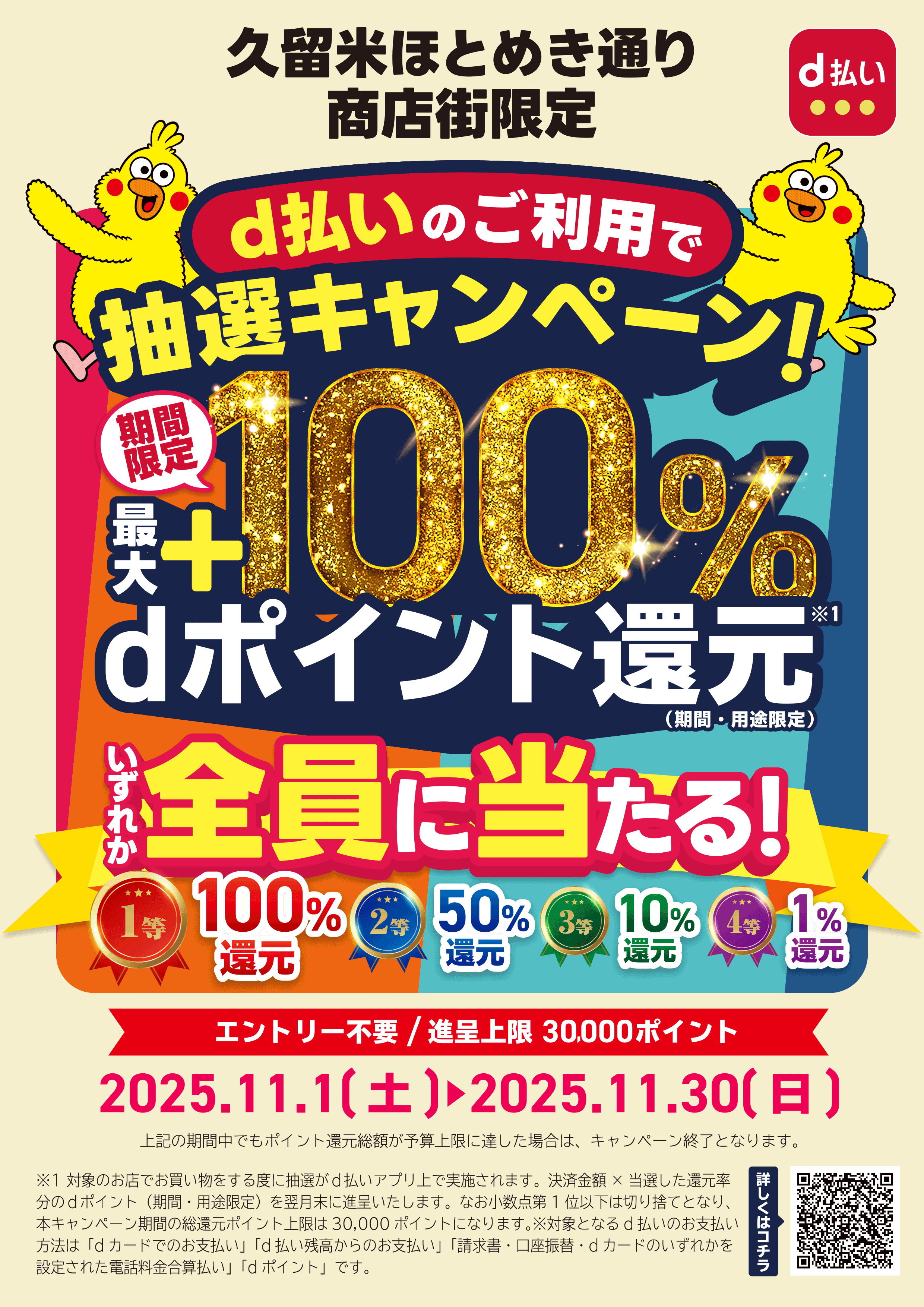久留米ほとめき通り商店街の対象店舗にてd払いでお支払いされたお客様に対して、お支払い金額の最大100%分のdポイント(期間・用途限定)を進呈いたします。