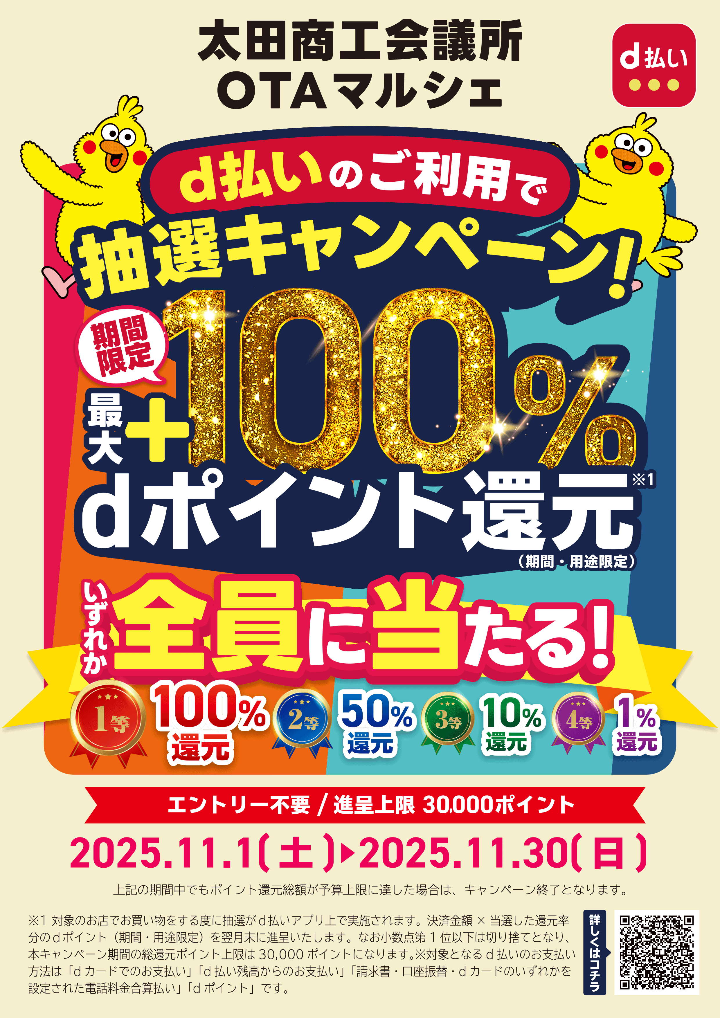 太田商工会議所・OTAマルシェの対象店舗にてd払いでお支払いされたお客様に対して、お支払い金額の最大100%分のdポイント(期間・用途限定)を進呈いたします。