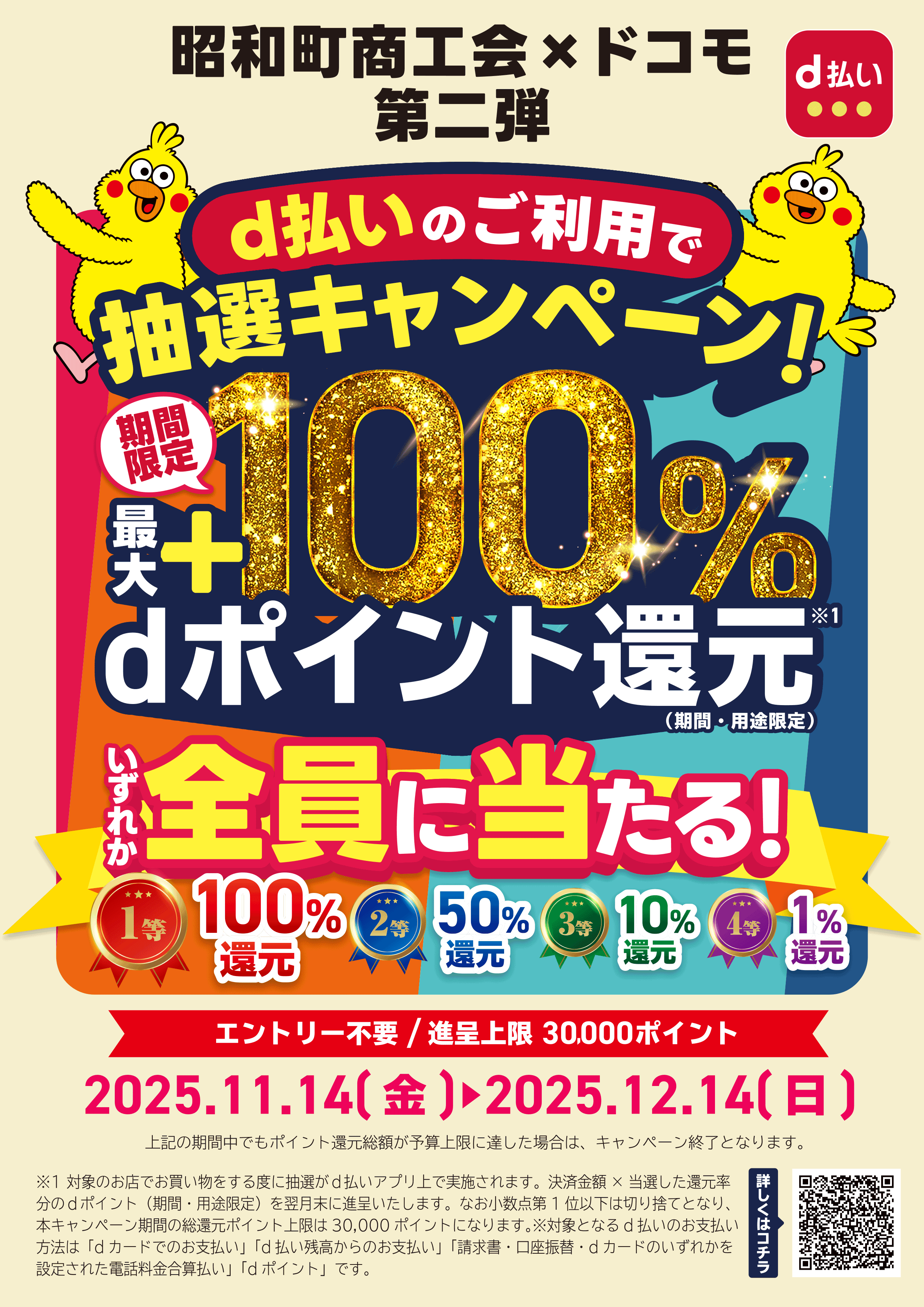 昭和町商工会の対象店舗にてd払いでお支払いされたお客様に対して、お支払い金額の最大100%分のdポイント(期間・用途限定)を進呈いたします。