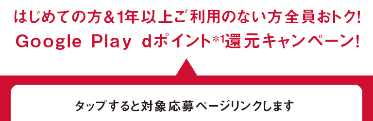 - 「招待者の方限定で全員おトク! Google Play dポイント還元キャンペーン」との重複適用は行いません。両方のキャンペーンへのご応募が確認された場合は、「はじめての方&1年以上ご利用のない方全員おトク!」側の条件にて当選判断を行います。(還元率の合算、重畳適用はございません)
