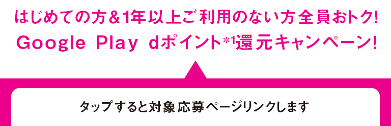- 「招待者の方限定で全員おトク! Google Play dポイント還元キャンペーン」との重複適用は行いません。両方のキャンペーンへのご応募が確認された場合は、「はじめての方&1年以上ご利用のない方全員おトク!」側の条件にて当選判断を行います。(還元率の合算、重畳適用はございません)
