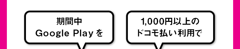 対象期間中に Google Play の「NTT DOCOMO利用料金と一緒に支払い」設定にて、1,000円以上ご利用頂くとご利用額の50%分のdポイント(期間・用途限定)を進呈いたします。(上限1万ポイントとなります。)