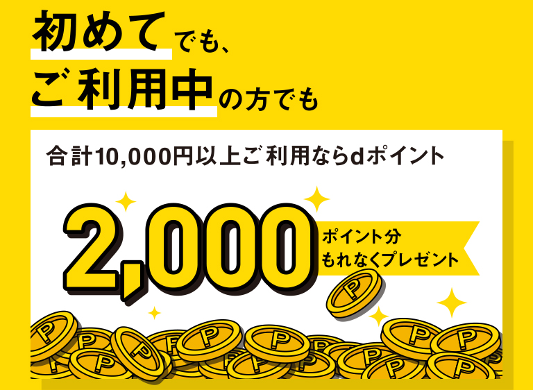 ※初めてご利用の方は、「100ポイント分のdポイント」、「2,000ポイント分のdポイント」のいずれかのみ獲得可能です。10,000円以上ご利用の場合は、「2,000ポイント分のdポイント」のみ、プレゼントとなります。