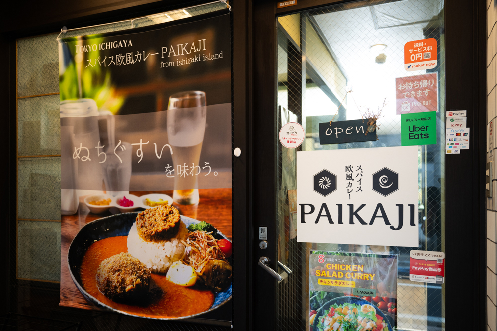 JR、東京メトロ有楽町線・南北線「市ケ谷駅」から徒歩3分ほどの場所にあるカレー専門店。店名の「PAIKAJI(パイカジ)」は、沖縄の宮古・八重山地方の方言で「南風」のことだそう。