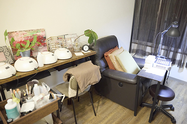 私自身はスタイリッシュなサロンも好きですが、当店にいらっしゃるお客さまは、静かで温かみのある空間を求めている人が多い印象です。そのため、ブラウン系の家具を中心に構成し、ネイルサロンがはじめての人や、大型店の賑やかさが苦手な人にも、友だちの家に来たような感覚でゆったりと過ごしていただきたいと思っています。