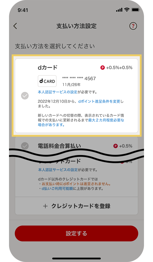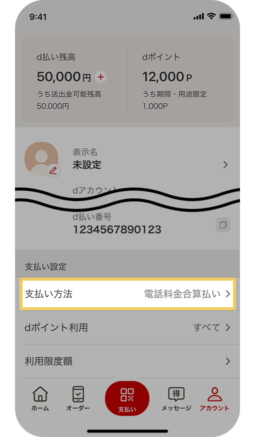 d払いアプリを起動し、ホーム画面の「アカウント」をタップします。