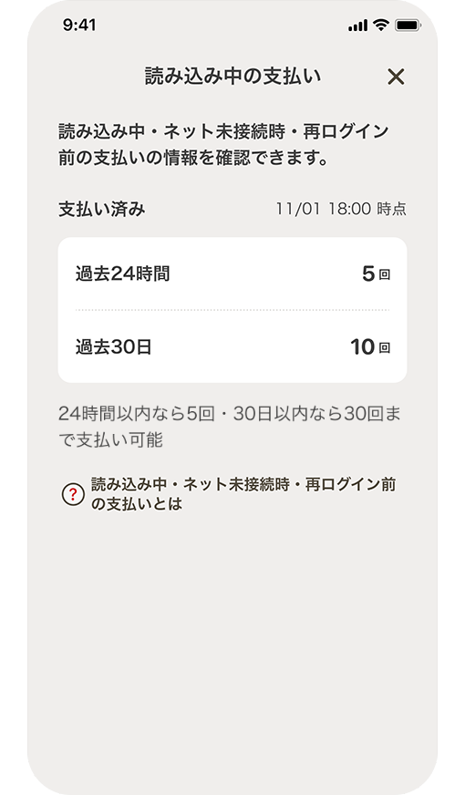 - ・決済回数を超過した場合は支払いできません。なお、アプリ上にエラーは表示されません。ネットワークの再接続を試みるか、他の支払い手段をご利用ください。