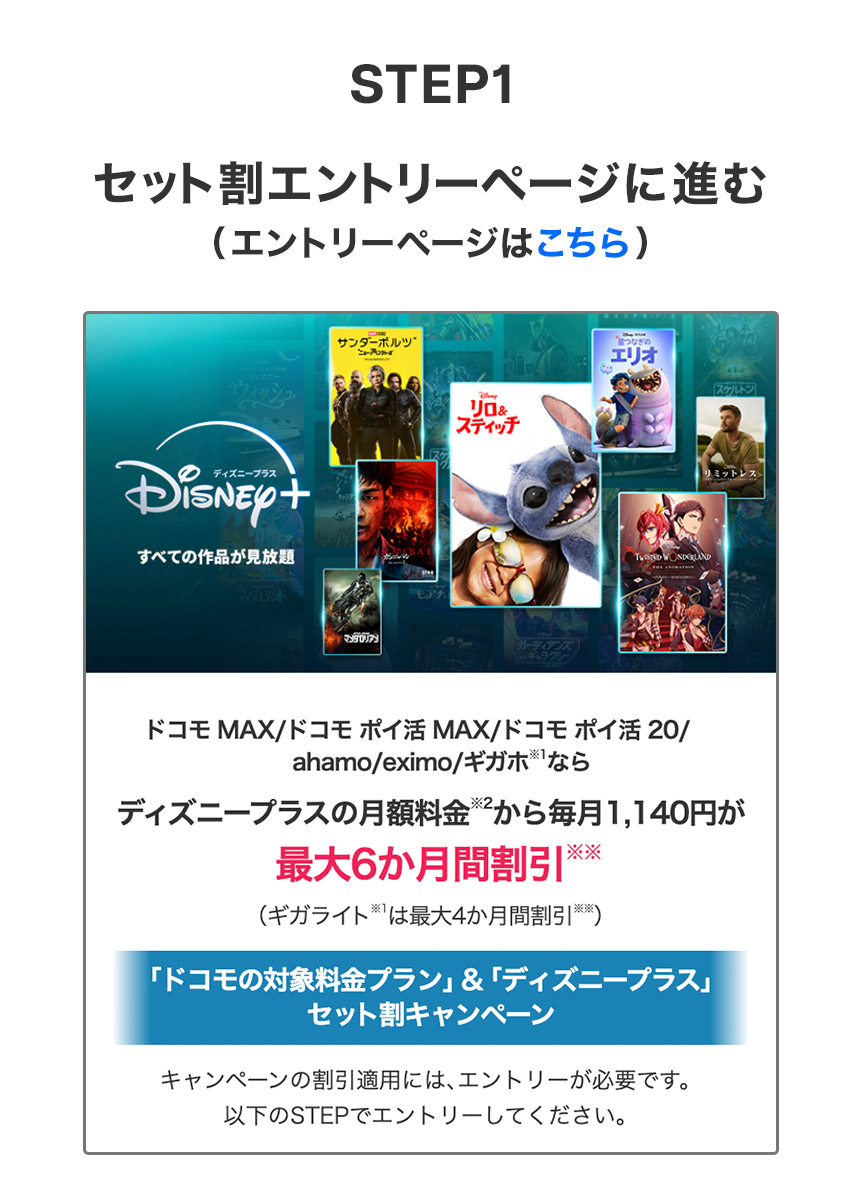 ※※ エントリーから6か月間(「ギガライト」の場合は4か月間)、適用対象期間中に「ドコモ MAX」「ドコモ ポイ活 MAX」「ドコモ ポイ活 20」「ahamo」「eximo」「ギガホ」または「ギガライト」(以下、「本セット割対象料金プラン」という)と「ディズニープラス」両方に契約されている場合に限り、ドコモケータイ料金とディズニープラスの料金から合わせて最大1,140円(ディズニープラスの料金が日割り計算となる月は日割り計算後の料金相当額)を割引きます(以下、「本セット割」という)。エントリー当月に本セット割対象料金プランに変更予約された場合は、当月から割引が適用されます。ディズニープラス プレミアム(月額1,520円)をご契約の方の割引額も最大1,140円となるため、差額分の最大380円をお客様にてご負担いただきます。エントリー当月より5か月目および6か月目に、「ドコモ MAX」「ドコモ ポイ活 MAX」「ドコモ ポイ活 20」「ahamo」「eximo」または「ギガホ」をご契約の場合には本セット割が適用となりますが、「ドコモ mini」「irumo」または本セット割対象外の料金プランに変更された場合は本セット割が適用されませんのでご注意ください。「ギガライト」ご契約の方で「はじめてスマホ割」「U15はじめてスマホ割」「ドコモの学割」「ドコモのロング学割」(以下、「本割引」という)適用中の方は本セット割は対象外です。本セット割へのエントリーは可能ですが、本割引適用終了後に本セット割が適用されます。